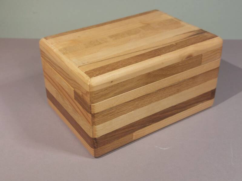 Holzarten: Nussbaum, Buche, Kiefer, Eiche u.a. geölt und lackiert. Maße: 18,0 x 11,0 x 8,6 cm. Preis: € 25,00